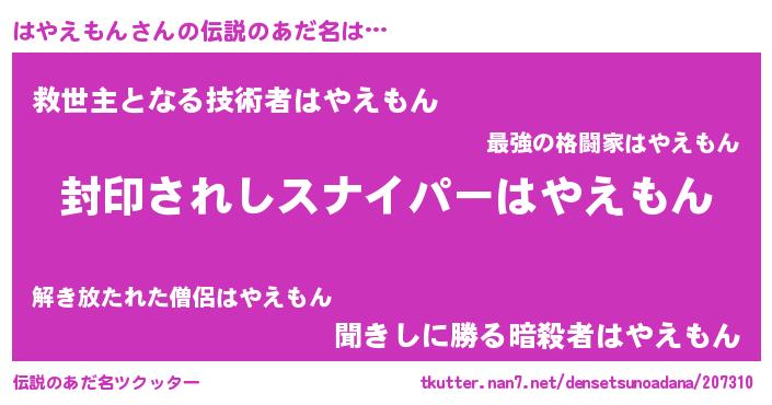 男性向けラノベタイトル風あだ名 | 『はやえもん~年齢イコール彼女いない歴の魔法使い~』 |