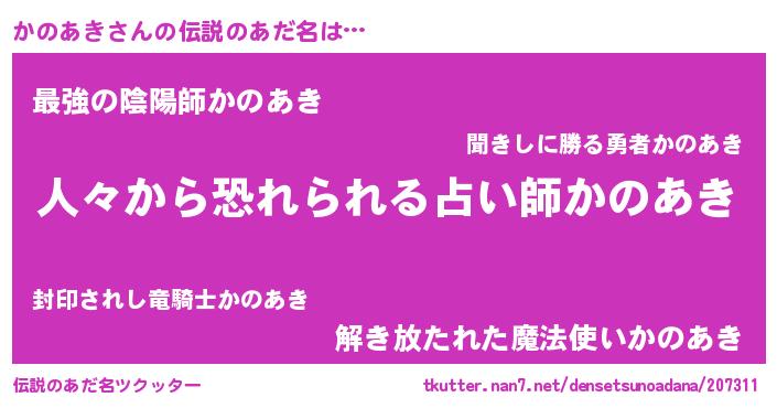 ヒーロー風カッコイイあだ名 | 『仮面カノダー』『慈愛の使者かのあき』 |