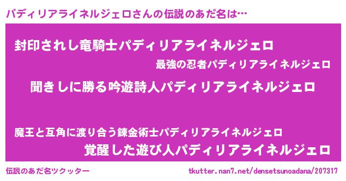 | 男性向けラノベタイトル風あだ名 | 『パディリアライネルジェロという概念が存在しない退屈な世界 』 |