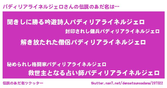| 男性向けラノベタイトル風あだ名 | 『ダンジョンにパディリアライネルジェロを求めるのは間違っているだろうか』 |
