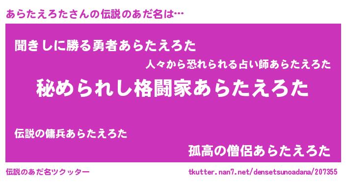| 女子向けラノベタイトル風あだ名 | 『シンデレラあらたえろた家の靴箱館』 |