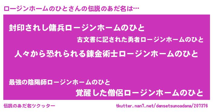 | 男性向けラノベタイトル風あだ名 | 『おまえをオタクにしてやるから、俺をロージンホームのひとにしてくれ! 』 |