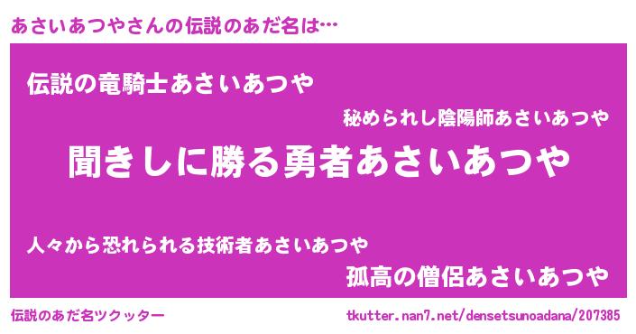 男性向けラノベタイトル風あだ名 | 『あさいあつやという概念が存在しない退屈な世界 』 |