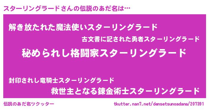 女子向けラノベタイトル風あだ名 | 『スターリングラードが死なない童話 林檎のスターリングラードの診療簿』 |