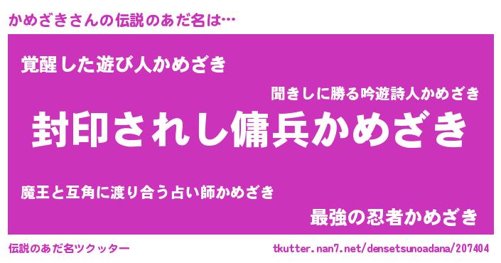 | 男性向けラノベタイトル風あだ名 | 『かめざき~年齢イコール彼女いない歴の魔法使い~』 |