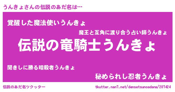 | ヒーロー風カッコイイあだ名 | 『スーパーウンキョ』『天弓騎士ウン』 |