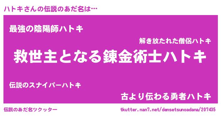 | 意味不明あだ名 | 『住所不定無職ハトキ(85歳)』『自称ハトキ』 |
