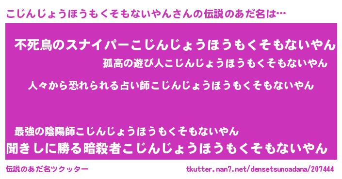 | 男性向けラノベタイトル風あだ名 | 『おまえをオタクにしてやるから、俺をこじんじょうほうもくそもないやんにしてくれ! 』 |
