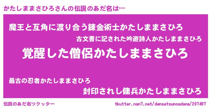 | 男性向けラノベタイトル風あだ名 | 『かたしままさひろの嫁は女の子じゃないと思った?』 |
