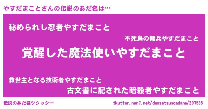 | 男性向けラノベタイトル風あだ名 | 『やすだまことの嫁は女の子じゃないと思った?』 |