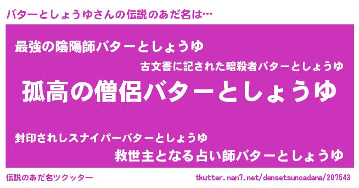 | 男性向けラノベタイトル風あだ名 | 『魔弾の王とバターとしょうゆ』 |