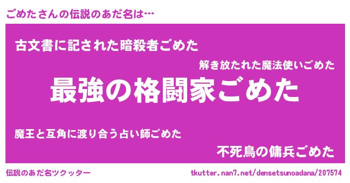 | 女子向けラノベタイトル風あだ名 | 『ごめたの玉の輿計画!』『闇のごめた』 |