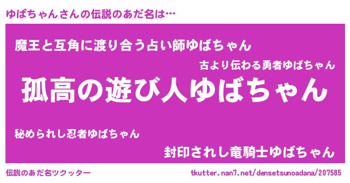 | 男性向けラノベタイトル風あだ名 | 『魔弾の王とゆばちゃん』 |