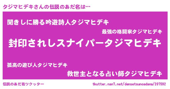 | 男性向けラノベタイトル風あだ名 | 『タジマヒデキ~年齢イコール彼女いない歴の魔法使い~』 |