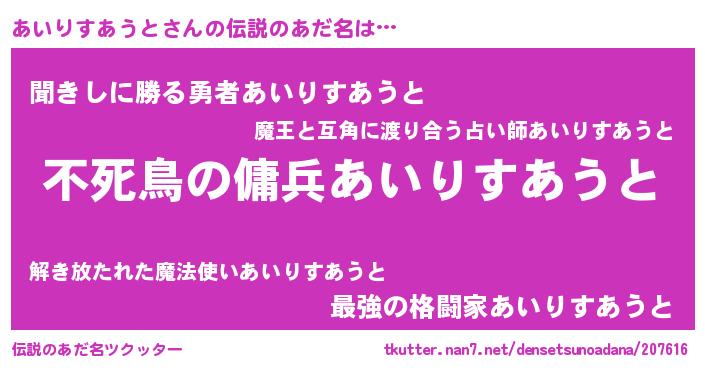 | 胡散臭い通販商品みたいなあだ名 | 『モテモテ間違いなし水晶球…その名も「あいりすあうと」』 |