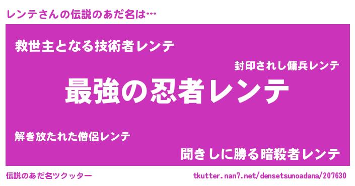 | 男性向けラノベタイトル風あだ名 | 『レンテに滅ぼされるだけの簡単なお仕事です』 |