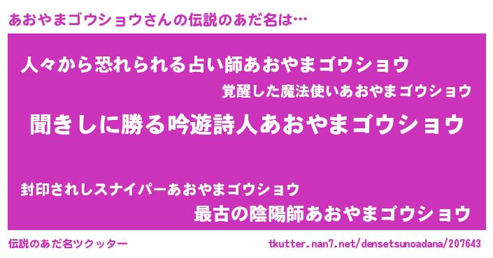 | 意味不明あだ名 | 『永久保存あおやまゴウショウ』 |