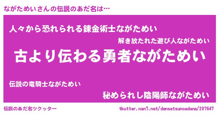 | 男性向けラノベタイトル風あだ名 | 『ながためいという概念が存在しない退屈な世界 』 |