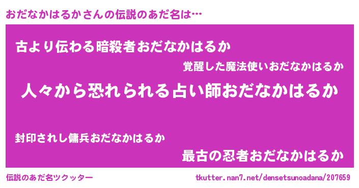| 男性向けラノベタイトル風あだ名 | 『おまえをオタクにしてやるから、俺をおだなかはるかにしてくれ! 』 |