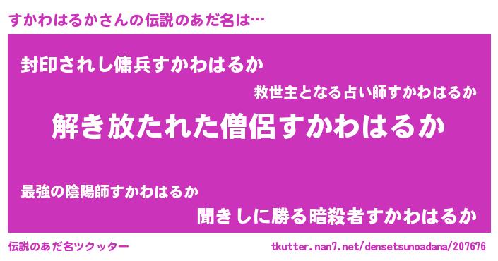 | ヒーロー風カッコイイあだ名 | 『魔戒騎士スカ』『スーパースカワハルカ』 |