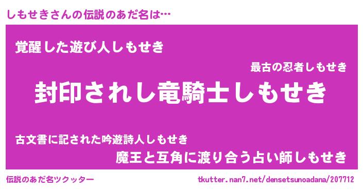 | 意味不明あだ名 | 『住所不定無職しもせき(11歳)』 |