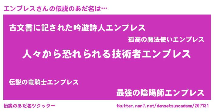 | 意味不明あだ名 | 『住所不定無職エンプレス(5歳)』 |