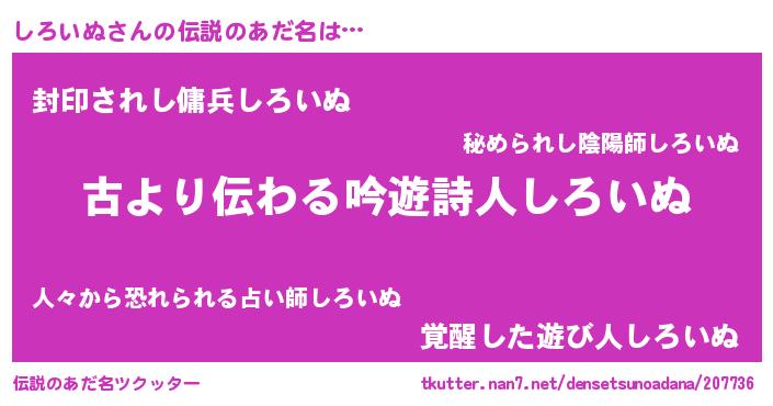 | 男性向けラノベタイトル風あだ名 | 『しろいぬという概念が存在しない退屈な世界 』 |