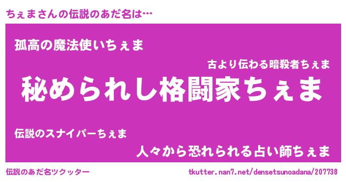 | 女子向けラノベタイトル風あだ名 | 『ちぇまなんてお断りですっ。』 |