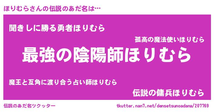 | 男性向けラノベタイトル風あだ名 | 『うちの娘の為ならば、俺はもしかしたらほりむらも倒せるかもしれない。』 |