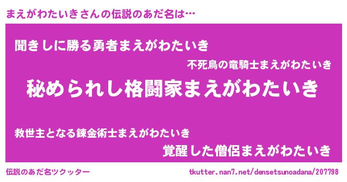 | 男性向けラノベタイトル風あだ名 | 『マエガワタイキスレイヤー』 |