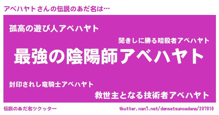 | 男性向けラノベタイトル風あだ名 | 『アベハヤト~年齢イコール彼女いない歴の魔法使い~』 |