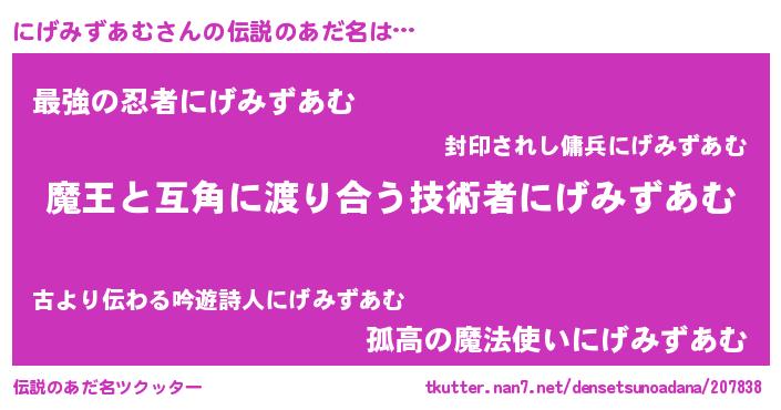 | 男性向けラノベタイトル風あだ名 | 『おまえをオタクにしてやるから、俺をにげみずあむにしてくれ! 』 |