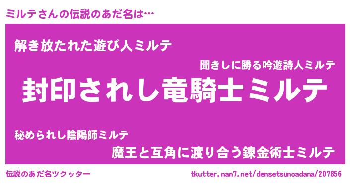 | 男性向けラノベタイトル風あだ名 | 『ミルテ~年齢イコール彼女いない歴の魔法使い~』 |