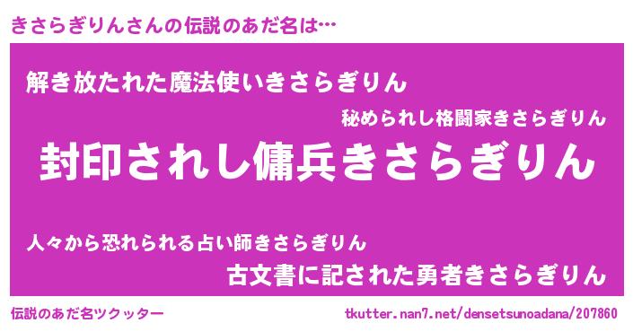 | ヒーロー風カッコイイあだ名 | 『スーパーキサラギリン』『天弓騎士キサ』 |