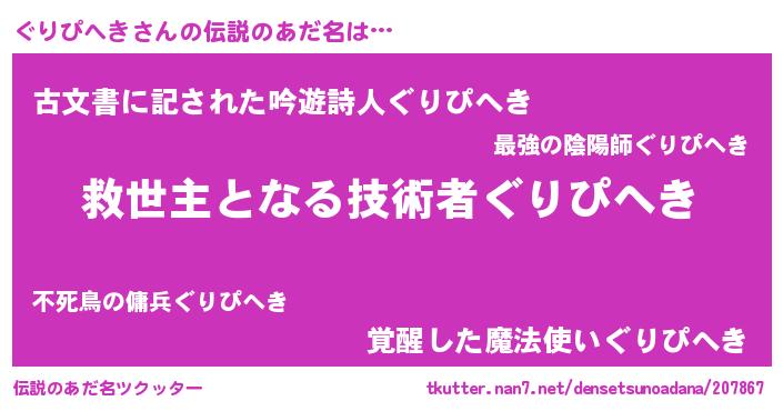 | 男性向けラノベタイトル風あだ名 | 『Re:ぐりぴへきから始める異世界生活』 |