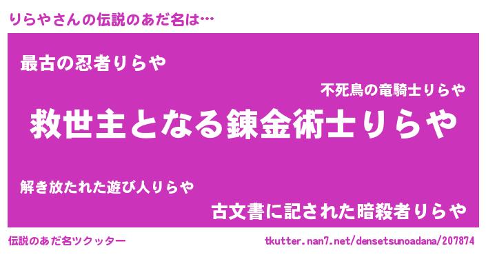 | 男性向けラノベタイトル風あだ名 | 『この素晴らしい世界にりらやを!』 |