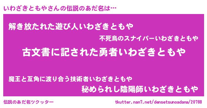 | 男性向けラノベタイトル風あだ名 | 『いわざきともや~年齢イコール彼女いない歴の魔法使い~』 |