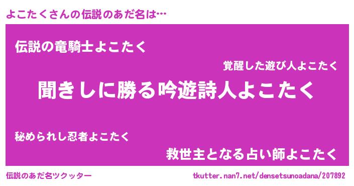 | 意味不明あだ名 | 『めかぶ科よこたく属』『自称よこたく』 |