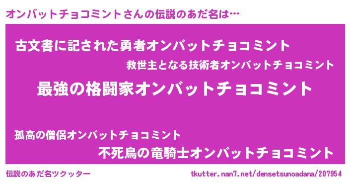 | 男性向けラノベタイトル風あだ名 | 『この素晴らしい世界にオンバットチョコミントを!』 |