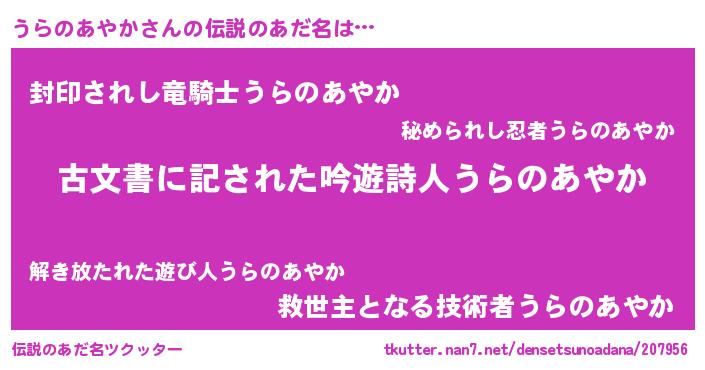| ヒーロー風カッコイイあだ名 | 『最強戦士ウラノアヤカ』『仮面ウラダー』 |