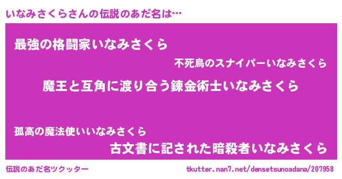 | 男性向けラノベタイトル風あだ名 | 『おまえをオタクにしてやるから、俺をいなみさくらにしてくれ! 』 |