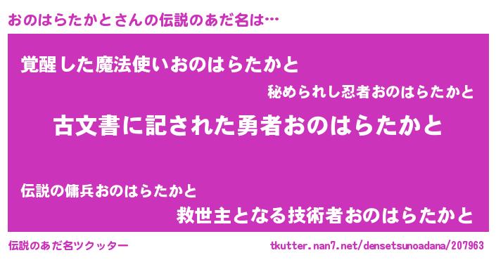 | 男性向けラノベタイトル風あだ名 | 『この素晴らしい世界におのはらたかとを!』 |