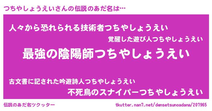 | 男性向けラノベタイトル風あだ名 | 『うちのつちやしょうえいが世界を掌握している!』 |