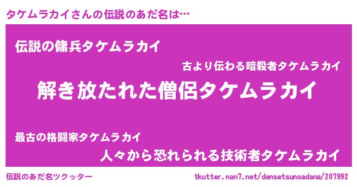 | 男性向けラノベタイトル風あだ名 | 『転生したらタケムラカイだった件』 |