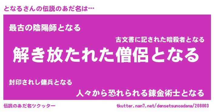| ヒーロー風カッコイイあだ名 | 『銀牙騎士トナ』『仮面トナダー』 |