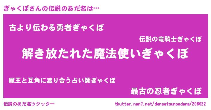 | ヒーロー風カッコイイあだ名 | 『魔戒騎士ギャ』『サイバー戦士ギャクボ』 |