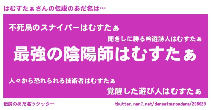 | 男性向けラノベタイトル風あだ名 | 『Re:はむすたぁから始める異世界生活』 |