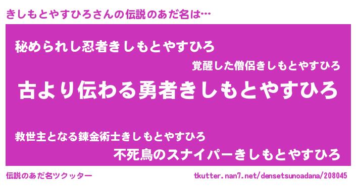 | 胡散臭い通販商品みたいなあだ名 | 『来世でも幸せになれる水素水…その名も「きしもとやすひろ」』 |