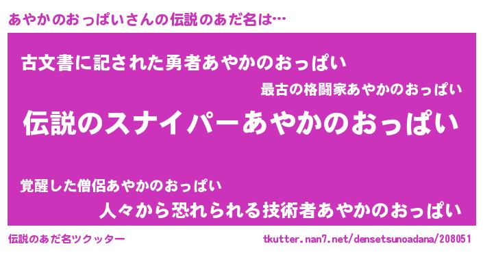 | 胡散臭い通販商品みたいなあだ名 | 『必ず成功する霊験あらたかなお札…その名も「あやかのおっぱい」』 |