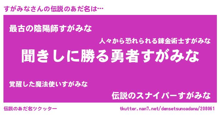 | 意味不明あだ名 | 『自称すがみな』『永久保存すがみな』 |
